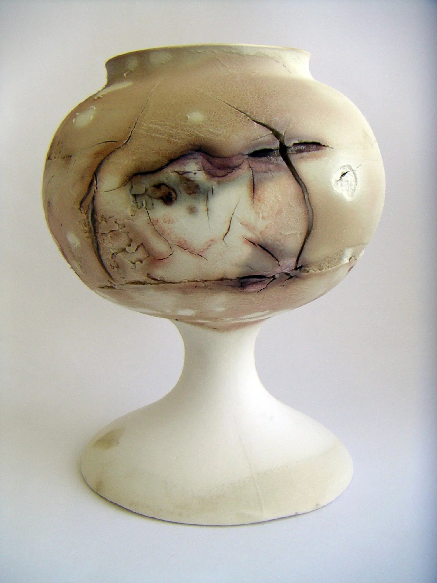 My work Medical Heirlooms explores the stigma of diseases, questioning contemporary obsessions with perfection and beauty. I have been manipulating the ceramic material in a way that emulates physiological processes, deliberately encouraging ‘faults’, ‘defects’ and ‘blemishes.’ These features add visual and tactual interest to the vessels, and are intended to mirror the interest and individuality that can be added to a person’s appearance by scars, flaws or deformities from medical conditions (their health legacy). Based on 17th -18th century apothecary jars, the forms have strong historical and medical links, as well as providing the metaphor of vessel as body: they become containers for disease, rather than holding the cure. As family heirlooms, the jars can be passed down through the generations in the same way as hereditary medical conditions.’